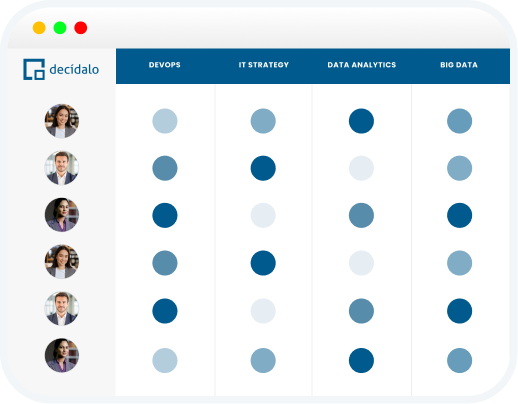 Most PSA tools track time and projects. decídalo tracks what your people can actually do.